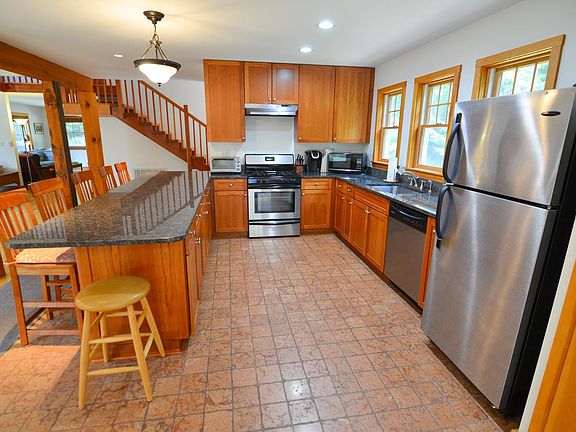 Bright and inviting home with an abundance of natural light, exposed posts and beams, floating staircase, and warm hardwood floors. Conveniently located, just minutes from Okemo Mountain and Ludlow Village, this is the perfect home to enjoy four-seasons living in Vermont. A gorgeous kitchen flows nicely to the deck and huge dining room with space for lots of family and friends. Three of the bedrooms are en suite with full baths with one conveniently located on the main level. All the bedrooms are large enough to accommodate multiple beds. The deck offers a great place for summer dining, sunny relaxing, or an evening hangout. The lower level leads outside to the hot tub for even more outdoor entertaining. When the nights are cool, gather around the living rooms pellet stove. When the days are hot, the home remains nice and cool with central air conditioning. Come see what this home has to offer.