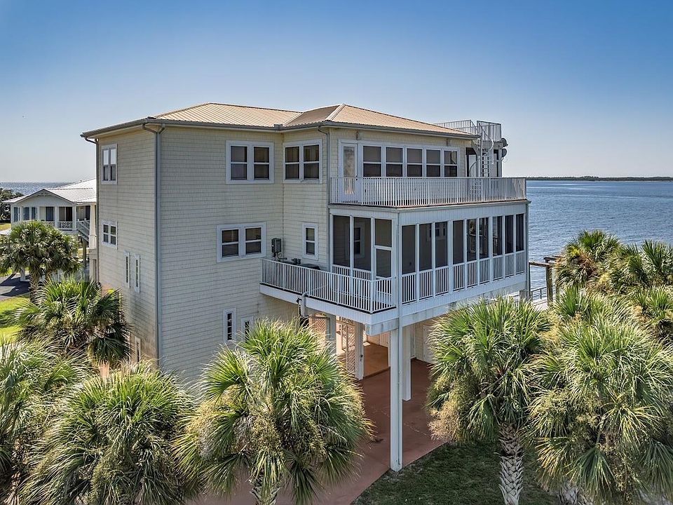 Gorgeous Ochlockonee Bay home! 3060 sq. dt heated and cooled with 360 views of the bay, 9 ft ceilings, 5 bedrooms, 2.5 baths this beautiful home has has so much to offer, with 5 large bedrooms, 2.5 baths, large open kitchen/dining and great room with fireplace overlooking the bay! Gourmet kitchen has an island bar, large pantry, appliances, and so much more! All bedrooms have a wood closet organizer in each closet, the master bedroom has a jet tub and a large shower with etched glass and gorgeous tile. Comes with an elevator to all floors, huge screened porch and open porches, outdooor kitchen, sundeck, two boat lifts and dock on the bay and an open dock at the mouth of the canal. Community bike paths and a beach at the end of Mashes Sands and wonderful seafood restaurants! Must see this gorgeous one of a kind home!!