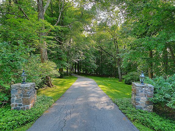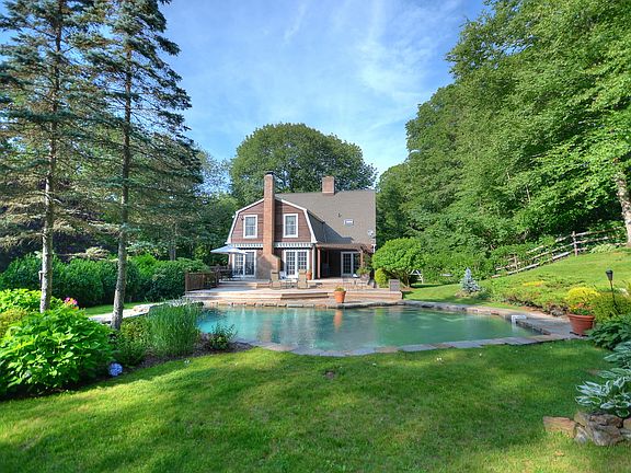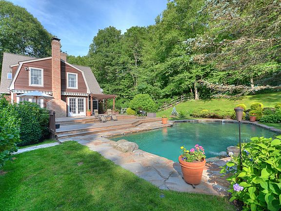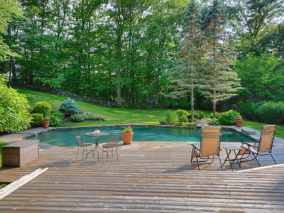 Wonderful, private Colonial with long gated drive on a great cul-de-sac in Bedford Village. New updates - 2 baths, updated kitchen appliances & freshly painted. Enjoy the summer on the expansive cedar deck overlooking the fabulous gunite pool. Lounge in the shade under the pergola w/views of the back lawn surrounded by perennials. This spacious 4 bedroom home has a great flow & is bordered by green space. Finished playroom w/Bath in walkout Lower Level. All hardwood floors, 2 fireplaces, above-ground oil tanks. Exterior freshly stained.