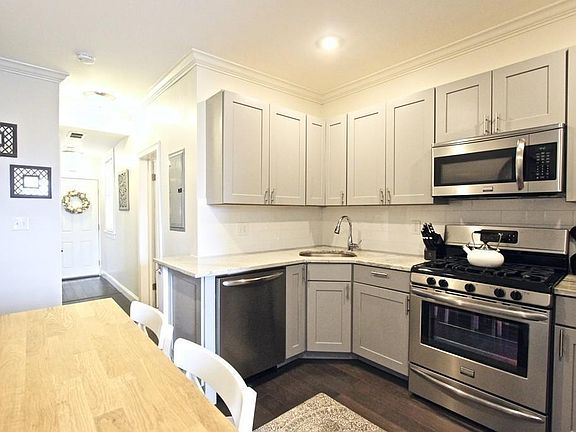 Beautifully renovated 3 bedroom condo in desirable East Boston locale. Gorgeous and functional eat-in chef's kitchen with granite counter tops, stainless steel appliances and gas cooking. Generous bedrooms with ample closet space and city skyline views. Two beautiful full bathrooms with custom tile work and vanities for extra storage. Central A/C, in-unit washer and dryer, a Nest thermostat, and more private storage in the basement. Enjoy the lovely patio & easy on-street parking. Seconds to T - Wood Island or Orient Heights, highway, tunnels and shopping/restaurants. Available Sept 1.