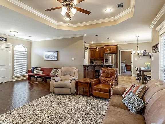 Live in the country but minutes from town. Around the corner from new elementary school. All electric 4BR/2BA w/ split bedroom plan. Built in 2013 with granite countertops, oil rubbed bronze fixtures, under counter sink. Trey ceiling with crown molding throughout house. Great space, open floor plan, walk-in closets in every bedroom. Covered porch off back, property line goes past fence to barbed wire fence. Huge lot 1.08 acres, fully fenced, security system.