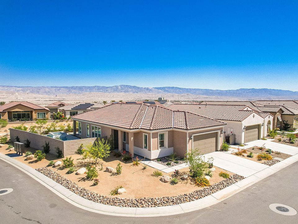 NEW in 2021! Flawless LIVING at Del Webb Rancho Mirage. Panoramic poolside + patio views to the South and West. Cascading spa is a delight both in form and function. LOVING the amazing San Jacinto + Little San Bernardino Mountain views. Walled and private. Desert inspired landscaping combined with this unique location are a treat for the senses. 64 Burgundy is an elevated, corner property fronting a green belt + walking trail. Modern chef's kitchen takes center stage. Living and dining areas flow effortlessly. 2 BD, 2 BA + den. Tall ceilings + open floor plan + smart separation of bedrooms. En suite master bedroom features dual vanities and expansive walk-in closet. Desert light is a theme for Del Webb's popular Expedition Plan. Upgrades include 40-foot pebble-finished pool, Tesla electric solar system, porcelain tile floors, quartz counters, reverse osmosis water softening system, 42-inch upper kitchen cabinets, garage insulation, utility sink (laundry room). This amenity-rich 55+ community sits in one of the desert's most desirable neighborhoods with the best of Palm Springs + Palm Desert just a short drive away. Enjoy resort style pools, fitness center, tennis, bocce ball, pickleball, virtual golf, putting green, walking trails. 64 Burgundy is calling. Enjoy it all.