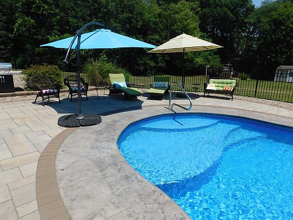 Staycation! Lovely Contemporary Victorian style home is flooded with light and is located in a well established community of similar style homes. Minutes to the Red Hook Village and schools make this home super convenient for anyone who lives a busy lifestyle. 4 Bedrooms PLUS an office, 3 Full baths, Updated gourmet Kitchen has granite, maple cabinetry & stainless steel appliances. Cherry floors are throughout and an abundance of natural light is provided from the over-sized windows. A full finished basement walks out to your own private recreation area where you can enjoy a dip in the recently added salt-water inground heated pool enveloped with gorgeous hardscape & plantings, a soak in the new hot tub, sprawling lawn for garden or play and a unique full lighted, basketball court for the athlete in the household! 1 acre of property is professionally landscaped, backing up to conservation land, which provides great protection. So much value here! Come see for yourself! Totally unique and nothing else like it on the current market in the area!
