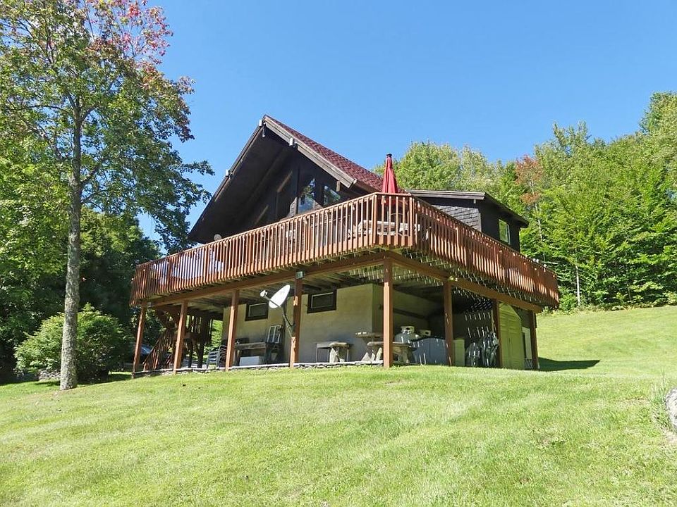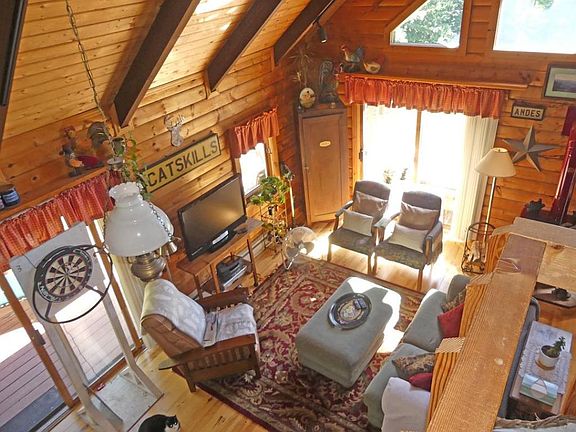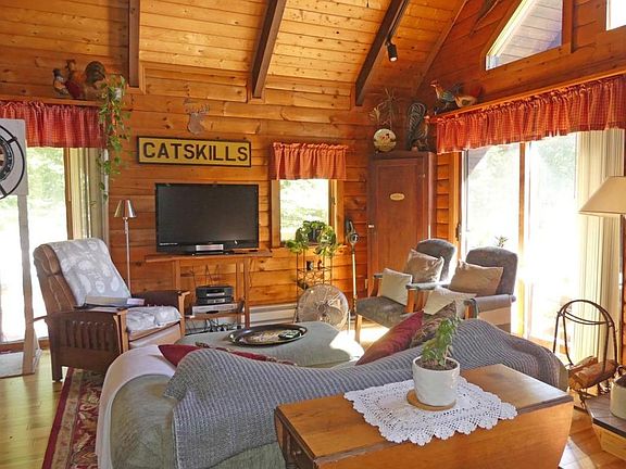 TUNIS LAKE LOG CHALET features a spacious, sunny GREAT ROOM with a soaring CATHEDRAL CEILING, hardwood and ceramic tile floors and many windows. Triple SLIDING GLASS DOORS lead outside to an expansive WRAP-AROUND SUN DECK. Living area sports an enamel propane gas stove for heat and ambiance. Gather around at the KITCHEN PENINSULA separating the dining area from the ample kitchen. FIVE BEDROOMS - One on the Main Level. 2 additional bedrooms and full bath on the 2nd story. And, 2 more bedrooms and bath on lower WALK-OUT basement level. Powder room on the main floor.Easy walk to spring-fed Tunis LAKE and all that it has to offer. SWIMMING, boating, fishing, 2 TENNIS COURTS, volleyball and Bocce. Or, just relax by the lakeshore with a good book and a cool drink.Just a few minute drive to the historic and charming Hamlets of Andes and Bovina. And, nearby you'll find Skiing, all sorts of Hiking opportunities, Antiquing, Restaurants and Entertainment.