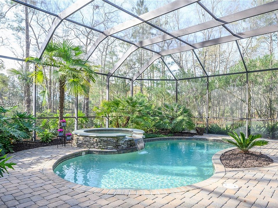 Your own private oasis in Berkeley Hall! 64 Clifton shows like a model home. Open floor plan w/ telescoping patio doors that open to screened lanai with heated pool, spa & outdoor kitchen. Top of the line quality throughout. Golf cart garage & bonus room over garage with full bath, wet bar, beverage center, use as entertainment area or 5th BR. Newer roof (2022), paint, foam insulation, expanded laundry room. Viking & Subzero appliances. White oak & Travertine flooring for easy maintenance. Berkeley Hall offers 2 Fazio golf courses, clubhouse, dining, day dock & pavilion, fitness center, tennis, pickleball & more!