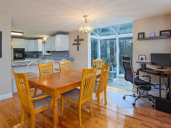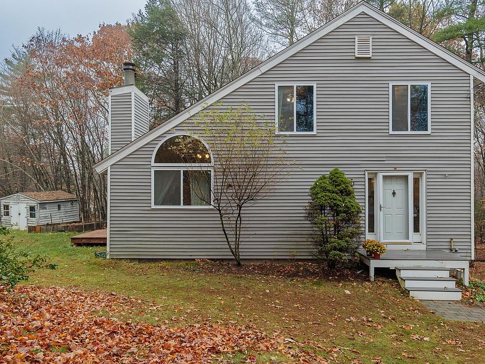 ACTIVE UNDER CONTRACT, Accepting Backup Offers. Don't miss your chance to live in Danville NH. Welcome to this inviting contemporary three-bedroom home, nestled on a private wooded lot at the end of a cul-de-sac in a peaceful neighborhood. Enjoy the warmth of a real burning fireplace under the cathedral ceilings of the spacious living room. The second level offers three bedrooms, a full bathroom, and a private sink area off the primary bedroom with a large walk-in closet. The main level is perfect for entertaining, featuring a large kitchen with an island, electric cooktop, and a peninsula with bar seating. Off the kitchen are a pantry, laundry room, and a full bathroom. New red oak hardwood flooring spans the first floor, complemented by natural light from the dining room's greenhouse window, sliders to the backyard, large windows, and skylights. Recent updates include new windows, roofing, and siding within the last five years. The lower level includes a two-car garage and a large finished area suitable for an entertainment room, gym, playroom, or office. Outside, a large deck leads to a masonry fire pit, a spacious backyard, an above-ground pool, and a storage shed. Explore nearby hiking trails and recreational paths, enjoying the outdoors in every New England season. This well-designed home features ample coat and storage closets, a central vacuum system, and forced hot water heating. With its high lot position, the basement has always been dry.