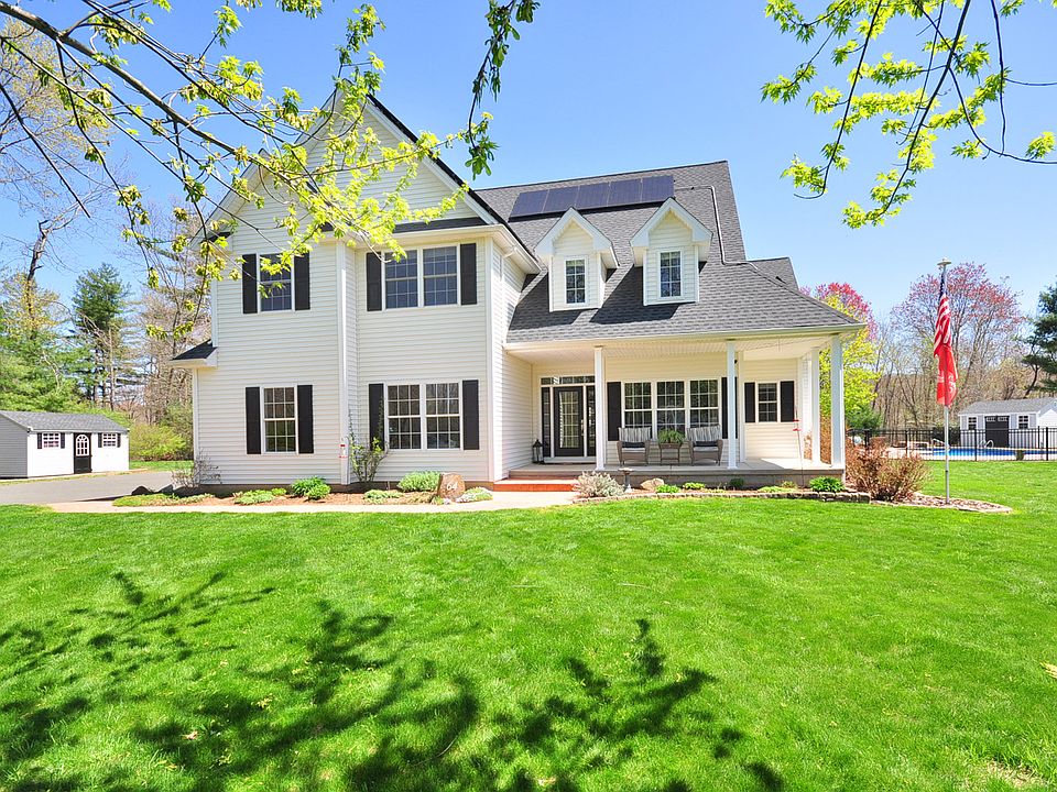Experience resort-style living every day in this exceptional 4 bedroom Colonial, set on 2.56 level acres in picturesque East Granby. Perfectly blending luxury & comfort, this beautifully maintained home features an inground pool, outdoor kitchen, & plenty of space to entertain, relax, & enjoy life to the fullest. Step into the inviting foyer & discover a formal dining room on your right, & a spacious great room with a cozy pellet stove straight ahead-ideal for gatherings year-round. The first-floor primary suite is a private sanctuary with a walk-in closet, full bath, & direct access to the back deck, perfect for morning coffee or evening unwinding. The eat-in kitchen is a chef's dream with granite countertops, stainless steel appliances, & easy flow to the outdoor oasis. A half bath & convenient first-floor laundry room complete the main level. Upstairs, you'll find 3 generously sized bedrooms, a full bath, (one bedroom could serve as a second primary suite) & an expansive bonus room with a second pellet stove-perfect for a family room, media room, home office, or even a fifth bedroom. The lower level offers ample storage space & exciting potential for finishing. Additional features include central air, solar panels, updated A/C, two oil tanks, a newer roof, & main level has all handicap accessible doors (40"wide), & an in-ground sprinkler system. Tucked away next to open space, this home offers a peaceful setting while still being minutes from it all-Rails to Trails, (Hiking & Bike trails), Parks, Copper Hill Golf Course, wineries and breweries, easy access to shopping, restaurants & Bradley International Airport. Train service is just a short drive away, & you're only a few hours from both Boston & New York City-ideal for commuters or weekend getaways. Don't miss your chance to own this incredible property-schedule your private tour today & embrace the lifestyle you deserve!