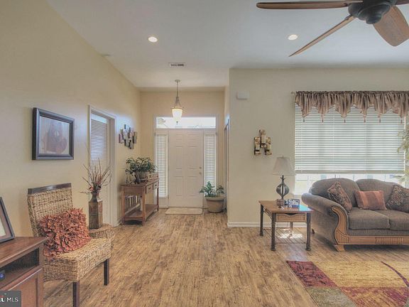 Desirable 55+ community with all the frills. Upgraded ceramic wood-look flooring, gas fireplace, spacious kitchen with corian counter tops and stainless steel appliances. Great room sizes with two full baths. One main bath with convenient wall-in tub - the master bath with walk-in shower and double sinks. This one story home has tons of closet space and private backyard with oversized patio. Security system, energy efficient solar panels, window treatments and light fixtures are featured. An immaculate and tastefully decorated home in a great premiere community.