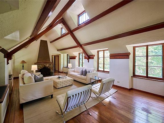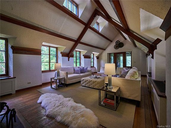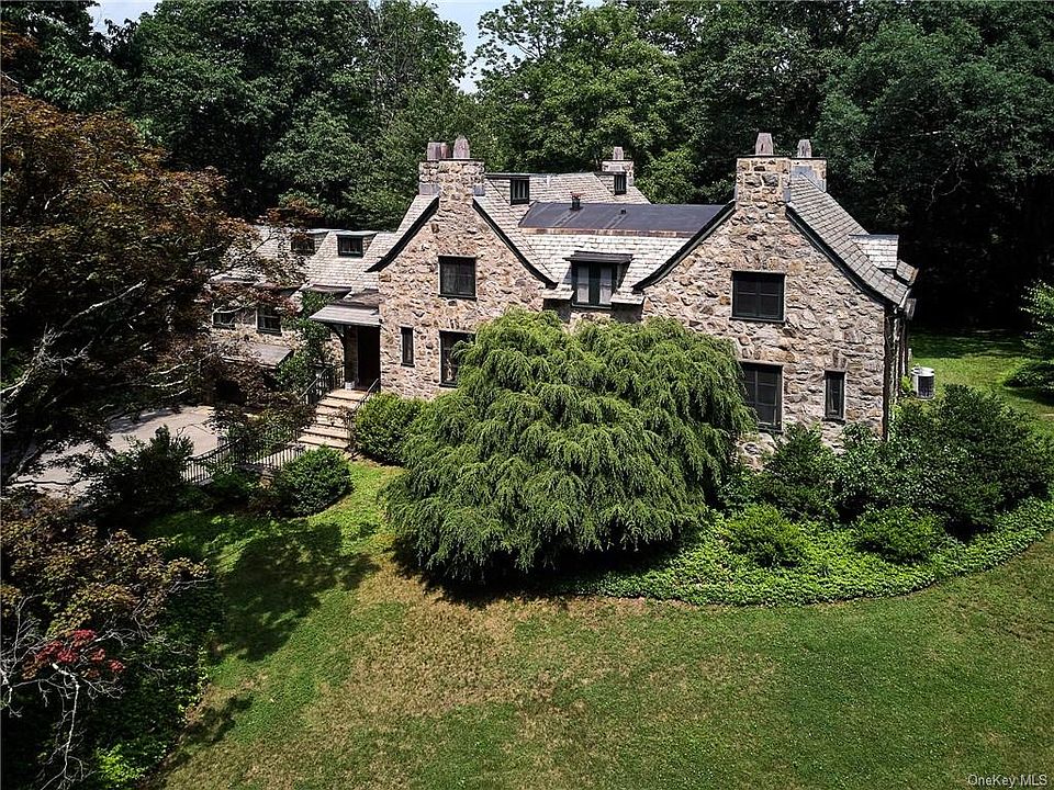 Storybook stone Tudor manor. Solid masonry construction. Striking slate roof. Wonderous dormered skylights diffuse naturally soft light. Entry vestibule w/powder room. Interior gallery w/veranda access. Main gallery w/beamed cathedral ceiling & copper-clad wood-burning fireplace adjoins wrap-around sunroom w/veranda access. Formal dining space. Butler's Pantry w/wet bar. Gourmet kitchen w/Wolf, Sub-Zero, Bosch & granite. Adjoining breakfast room. Family room w/exposed beam ceiling & built-ins. Main floor guest/au-pair suite w/sleeping quarters, full bath & sitting area. Primary bedroom suite w/three exposures, dressing area & ensuite bath. Two beautifully skylit bedrooms. Quaint den/study/sleep space. Updated hall bath. Unfinished partial basement w/laundry, mechanicals & attached 2-car garage access. Two additional separate detached 1-car garages. Beautifully established landscaping & lush lawn rolling down to ephemeral pond. 5+ very serene, private acres. Chappaqua schools & train.
