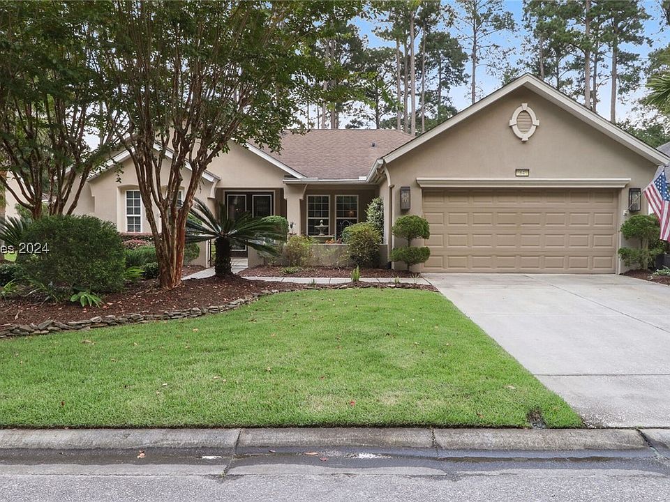 Beautifully appointed Longleaf Estate Model in Sun City Hilton Head, backs to the 1st hole of the magnificent Hidden Cypress Golf Course! This home has it all! Golf & wooded view. Huge heated & AC Sunroom. Fireplace w/ Gas Logs in Carolina/Family Rm w/ beautiful built-ins & gleaming porcelain tile floors. Stunning, glass double front doors welcome you to this exquisite home. Wood floors in LR, DR, bedrooms & office. 3 bedrooms total, 2 full baths + a private office! Enormous, primary bathroom w/walk-in closets. 2381 sqr ft! Enjoy time on the private patio of this estate-sized lot w/ many upgrades. Fridge, HVAC, Garage Door Spring all in 2024.