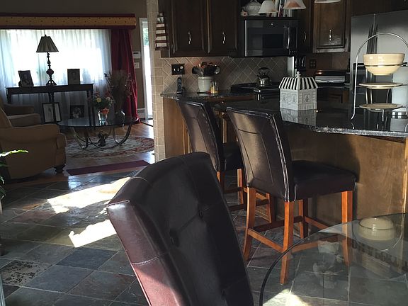 • Kit Dscrp: Countertops - Stone/Granite/Solid, Breakfast Bar / Nook, Kitchen Island, Ceiling - Beamed, Lighting - Pendant, Ceiling - Vaulted