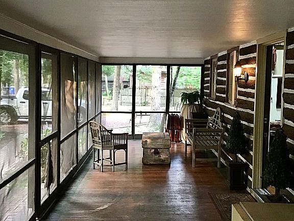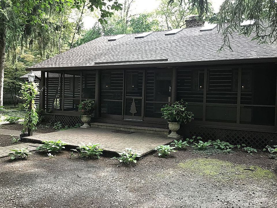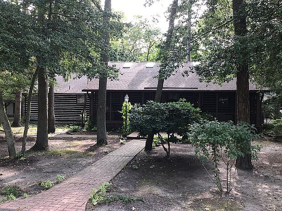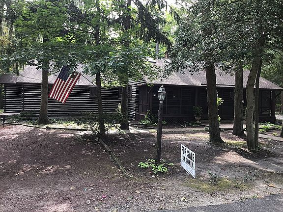 This very special, one of a kind historic split log cabin is situated in the heart of beautiful Medford Lakes, N.J. There is a wonderful stamped brick patio entry that leads to the expansive front screened in porch, complete with original mahogany flooring. Enter through the Dutch door and you are greeted by an impressive floor to ceiling functioning stone fireplace. The open floor plan allows the living and dining rooms to create a wonderful and inviting “lodge room” with stunning 17ft ceilings complete with 5 skylights and wooden beams. You’ll immediately notice the gleaming 9inch plank pine flooring that is original to the home and run through out the home. The roomy dining room is separated from the updated kitchen by an attractive and very useful breakfast bar. The kitchen feature stainless appliances, granite countertops, travertine subway tile, stacked windows and a ceiling fan. The living room opens to a family room with 4 windows and a beamed peaked ceiling with a fan. The attractive master bedroom (14x12) is painted neutral with tongue and groove wood walls and the high ceiling boasts a ceiling fan. The updated master bath has a vaulted ceiling with recessed lighting and is completed with a tub/shower combo and beautiful neutral porcelain flooring. Bedroom 2 is (13x12) with a soaring ceiling and the gleaming pine floors. Bedroom 3 is (12x11) and is light and bright with plenty of windows. The laundry area is located off the hallway. The 2nd bathroom’s renovation has been started but is incomplete. Most materials are on site for buyer to complete. The cabin is situated on a beautiful oversized lot with a horse shoe driveway that provides more than ample parking. A back wooden deck needs to be replaced as well as wood siding on a small back alcove that surrounds the deck. The home uses natural gas and has central air. A new furnace (Installed Jan 2020), water pump and hot water heater are located in the utility basement. The cabin has well water and public sewer. A new roof, gutters and 5 skylights were added late 2017. This charming home is being sold as is.