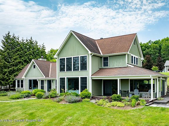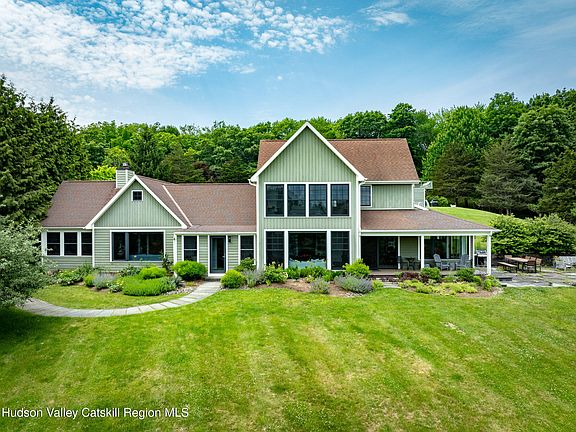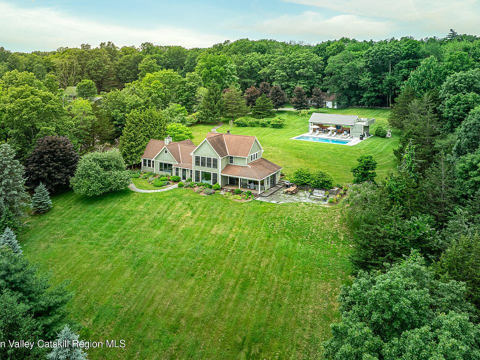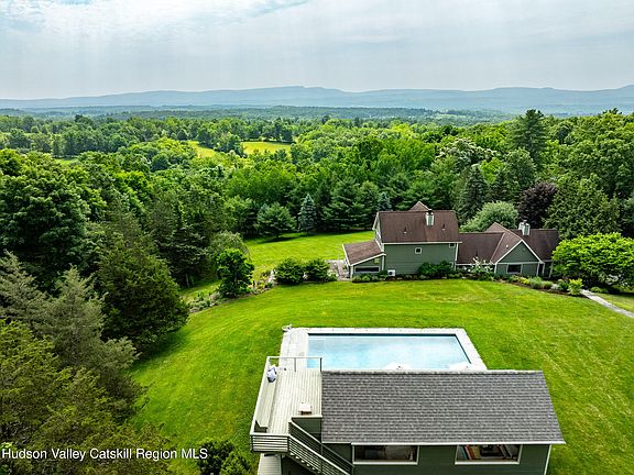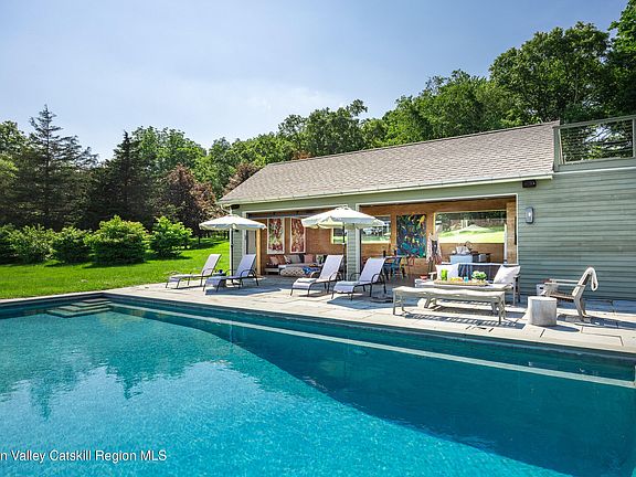 Set on 7.5 private acres with sweeping, cinematic views of the Shawangunk Ridge—including a direct sightline to the iconic Sky Top Tower—this completely reimagined property offers a rare blend of thoughtful design, refined comfort, and serene natural beauty. Since purchasing the home in 2015, the current owners have transformed it from the ground up. Working with a prominent architect, they redesigned the layout to enhance flow and functionality while creating a home that feels cohesive, intentional, and beautifully resolved. Expansive picture windows throughout the home frame the surrounding landscape and fill the interior with light. The living room features custom built-ins, a large wood-burning fireplace, and exposed beams—elements that lend warmth and character to the modern aesthetic. The kitchen is outfitted with custom cabinetry and high-end appliances, and just off the kitchen, a bluestone patio invites al fresco dining in warm months. The main-level primary suite includes a separate sitting room—perfect as a den, office, or a quiet retreat—and a bedroom with another cozy wood-burning fireplace and an abundance of windows that bring in light and views. Upstairs are two generously sized guest bedrooms and a full bath, both with beautiful views of the Ridge. Outdoors, a heated gunite saline pool sits alongside a stylish pool house complete with a full kitchen, powder room, and a rooftop deck offering jaw-dropping vistas. There's also a separate studio with soaring ceilings, a bathroom, and full heating/cooling—currently used as a large art space, and easily adaptable as a workshop or creative studio. Between the indoor layout, the bluestone patio, the pool, rooftop deck, and fully equipped pool house, this home is truly an entertainer's dream—perfect for hosting large gatherings or enjoying quiet personal retreats.