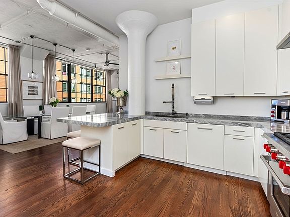 Classic South End loft living meets modern luxury. This residence offers approx. 2,826sf of single level living space featuring 12 ft ceilings and 9 ft tall windows across 4 exposures. The residence features 3 bedrooms and 2 bathrooms including an oversized primary suite w/ a spa-like 5 piece bathroom w/ steam shower & large walk in closet. The entry is striking as the home sprawls from the well appointed, spacious kitchen w/ Carrara marble countertops & backsplash & top of the line appliances to the open concept dining space on one end of the home overlooking the main living area on the other end featuring an architectural gas fireplace. This home is complete w/ a generous guest bedroom, a 3rd bedroom currently being utilized as a home gym, a den adjacent to the living room, hardwood floors & industrial loft details throughout, two deeded (1 tandem) garage parking spots off-site, common patio & a vibrant South End location convenient to acclaimed restaurants, cafes, boutiques & more.