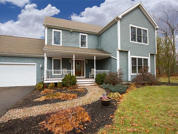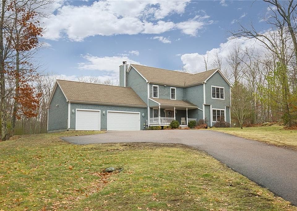 Welcome home to this spacious 4 bedroom, 2 1/2 bathroom, 3 car-garage Colonial nestled in 4 acres off a private cul-de-sac in Glocester RI. Offering open floor plan through eat-in kitchen w/stainless steel appliances, granite countertops and breakfast bar, hardwoods throughout and into cozy living room with fireplace, formal dining room leading through sliding French doors and into bright and sunny office/den. First floor laundry room and lavette, grand foyer boasting winding staircase leading up to 4 bedrooms & 2 full baths including master suite w/ walk-in closet, large private batbroom w/ jacuzzi tub, and shower. Finished basement boasts an additional 891 sf of living space including theater room complete with stadium style seating, game room, recreation room with dry bar, and an additional room which could be used as a gym, additional office, playroom, or den, and utility room with whole house water filtration system. Exterior cedar dipped shingle siding, covered front porch with Trex decking, brick walkway, rear patio, and freestanding screened porch set back in large backyard- perfect for entertaining and summer events!