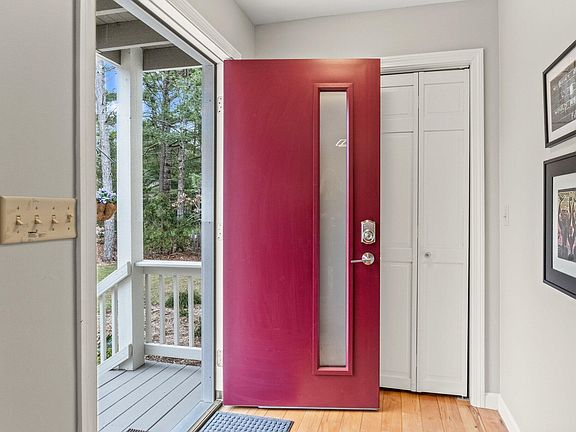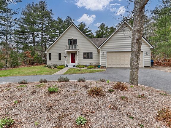 Falmouth Mares Pond area: This is a fabulous 3 bedroom, 3 bath custom contemporary nestled on a wooded lot just over a half acre. This house has 8 rooms, including a spacious open living room that blends into the kitchen and dining area. The kitchen is about a year old with stainless appliances including a modern 5 burner induction stove. Then there's a separate family room with cathedral ceilings and gas fireplace and sliders to a huge wrap-around sundeck--1st-floor primary with a walk-in closet, full bath with custom shower and double vanity sinks. There is an office, a bedroom and another full bath and 1st floor laundry that complete the first floor. The second floor is a 2nd primary with sliders to a private balcony, a private bath, and a large sitting room or office. Large 2-car garage with a large storage room with direct access to back yard. 2X6 walls with efficient gas heating, Andersen windows & more. Don't wait on this one! Note: hanging light fixture in the family room not included.