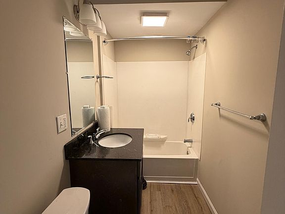 Bright and updated 2-bedroom apartment featuring an open layout, wood-style flooring, and neutral painted walls throughout. The kitchen offers modern dark cabinets, granite-look countertops, and black appliances. Spacious bedroom with closet, and a clean, updated bathroom with tub. Large windows provide great natural light. Located in a quiet, well-maintained building.