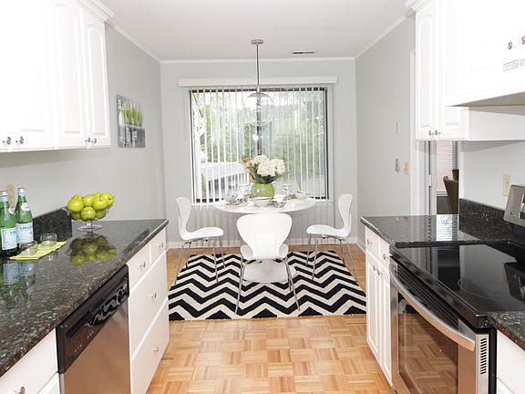 Comfortable, spacious, totally updated, in mint condition, with large windows and lots of light. Absolutely nothing to do except move right in. Freshly painted, brand new beautiful carpeting where seen, new light fixtures, remodeled bathrooms and kitchen with stainless steel appliances, granite countertops, charming breakfast area. W&D in closet in the kitchen. Large LR/DR room combination with working fireplace and built ins. Master Bedroom has balcony overlooking the yard. Unit comes with a garage, located through the basement of the building. Friendly complex with swimming pool and club house. Beautiful, quiet, private, serene garden setting. Hidden at the end of Hills Lane, this gem is a real find. Not to be missed!