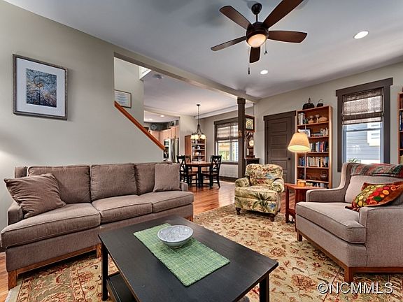 Healthy Built Montford home by Greencraft. High ceilings, open living area w/wood-burning fireplace.Open kitchen w/stainless appliances & island seating opens to large back deck. Pantry & main floor laundry. Gorgeous tile baths, master suite w/tray ceiling & large closet. Bright walk out lower level is finished for weaving work space, and could also be a fantastic play room or guest area! Lovely landscaped yard. Walk to downtown!