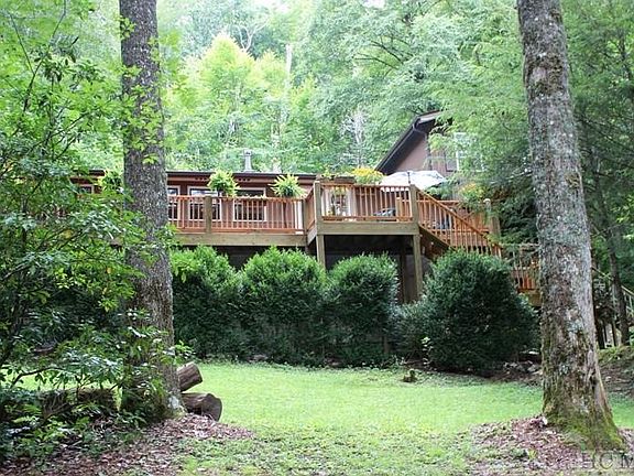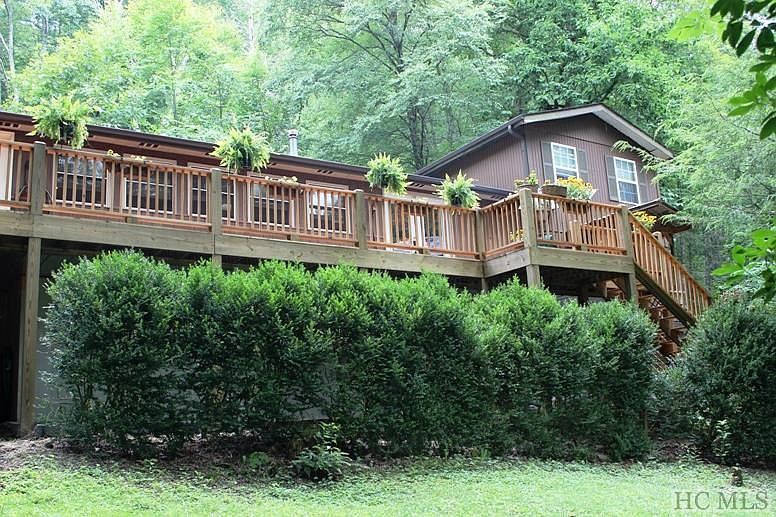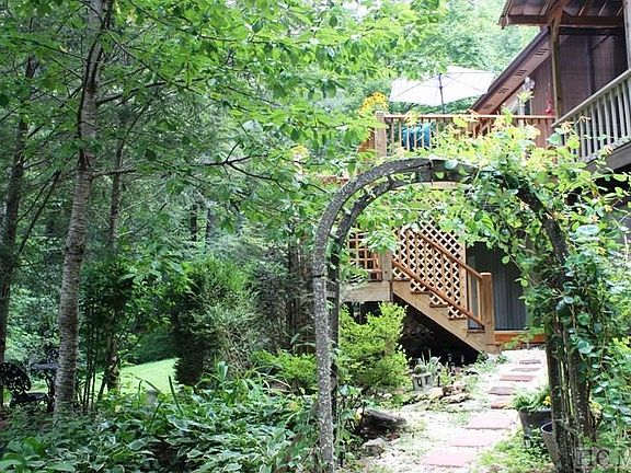 Totally private (end of the road )attractive home with gazebo, covered porch, large deck, giant garden, garden shed and a stream on +/-2.59 acres, make for perfect mountain living. In this 3 bedroom/3 bath home the main room has a ventless gas logs stone fireplace, and a separate wood stove, cedar walls, wood floors and new butcher block counter tops. The mother-in-law suite has a covered deck off of the kitchen that has all new stainless appliances, including a 5 burner gas range.There is a two-car detached garage. Lovely rustic artist building in the garden area. This quiet home features a park-like setting in a wonderful neighborhood, approximately equidistant to Highland, Sylva & Franklin. The encapsulated basement also has a workshop area with an additional washer/dryer for mother-in-law suite. There is even a chicken coop! Near Lake Glenville.