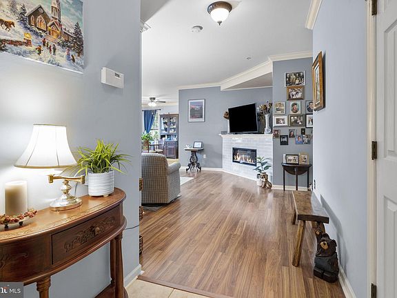One of the nicest units in Scotch Run, this first floor 2 bedroom 2 bath has been recently updated with new flooring in the kitchen and primary bedroom, all new double hung tilt in windows and hot hot water heater. Enjoy the ease and convenience of first-floor living. Step into the entryway and you'll immediately have the feeling of "home" envelope you. The light-filled living room features a electric fireplace perfect on chilly winter nights. The dining area boasts hardwood floors and access to the cozy patio. Entertaining your friends is a breeze with the open kitchen. Thoughtfully designed, the upgraded kitchen has plenty of counter and cabinet space, stainless steel appliances, and even a breakfast bar. Enjoy your morning coffee at the bar or slip out the French door to the patio. The primary suite is surprisingly large, offers a walk-in closet, a private view of the trees, and a spa-like bathroom. Soak away the stress of the day in the over-sized garden bathtub. The second bedroom also has hardwood flooring, ample closet space, and the other full bathroom just outside of the door. Take note that the two bedrooms are located on opposite sides of the home, creating a private environment in both bedrooms. The large laundry room also provides extra storage space. Not only does this end unit have trees on one side but it also has no building across the parking lot. You will enjoy the expansive unobstructed views as well as extra parking. Another great benefit of this prime location within the community is that the fitness center only steps away. There's no need to pay for a gym membership when you can take advantage of the new gym with all new equipment, flooring, the works! Scotch Run is conveniently located near commuter routes, shopping, and some really great local restaurants. Truly turn-key condition. Convenient first floor living with no need to haul groceries up steps. Call to schedule your private tour today and get ready to call this one "home."