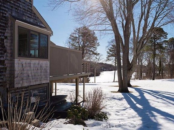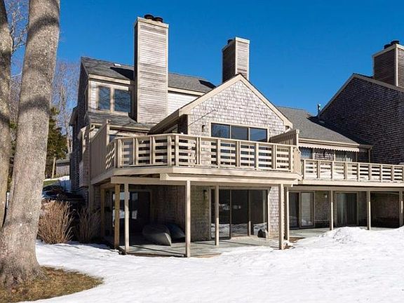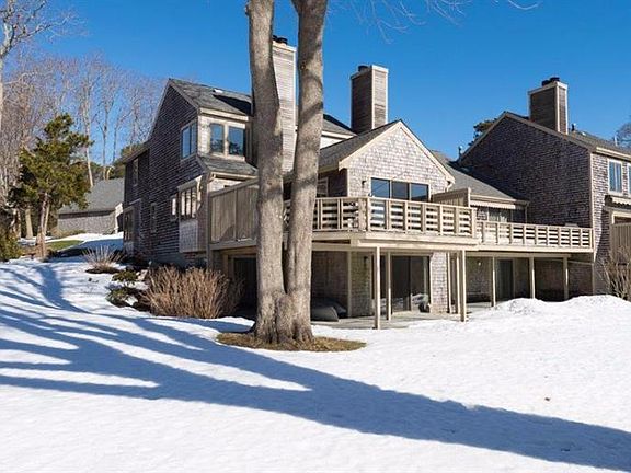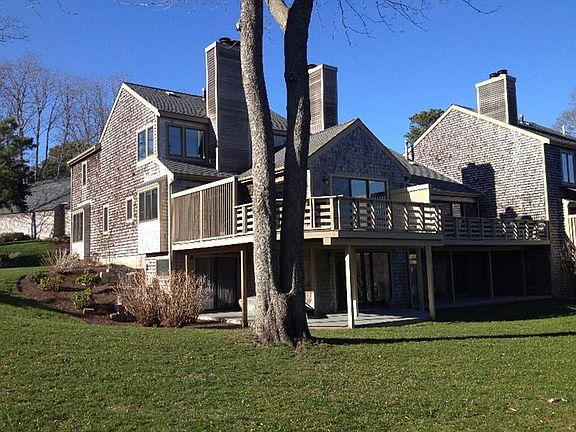 Waterfront! This spacious and private end unit townhouse has commanding south-facing views of Oyster Pond. Extra windows have been added in the kitchen, first floor den and Master Bedroom that provide an abundance of light. On the first floor there is a large open fireplaced Living Room/Dining Room, an eat-in kitchen, laundry and a cozy den. The waterside wrap around deck is protected by a large shade tree on hot summer days. On the second floor, the Master Bedroom has another fireplace and an ensuite bath that has been totally renovated with a fabulous design and finishes. The Lower Level has a family room with a wall of built-ins and a slider to another deck which opens out to a sprawling lawn. A one car detached garage is included. Treetops amenities include the heated pool, tennis courts, kayak dock, deeded beach rights and clubhouse.
