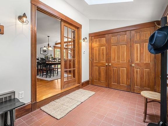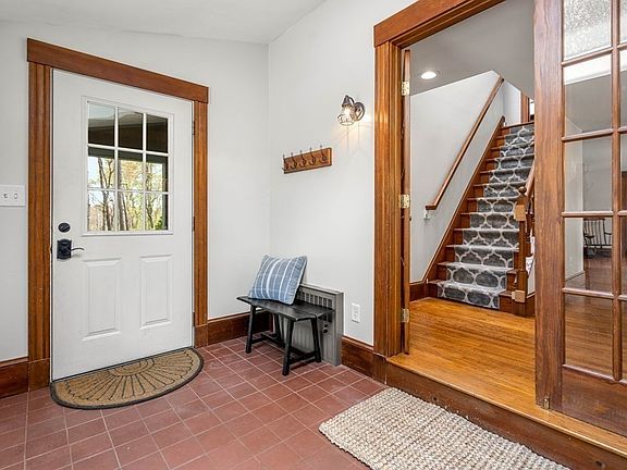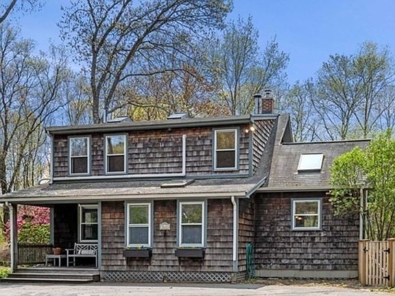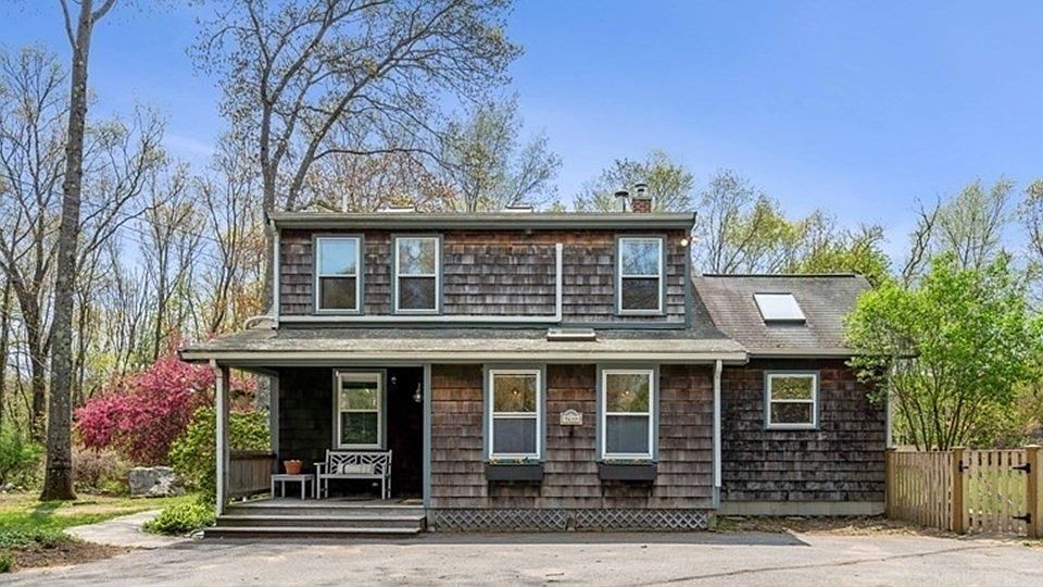 On a beautiful half acre of land just outside of Newburyport, this charming three bed, two bath Shingle-Style Colonial is a true gem. The quaint front porch leads you into the spacious tiled foyer where you are welcomed by classic French doors. Met with gorgeous hardwood floors, find an open dining area and kitchen to your right, featuring a large center island, stainless appliances, custom wood cabinetry and vaulted ceiling with exposed beams. Access your hardscaped patio and fenced-in yard through the glass sliders or through the enclosed back porch. The first floor also features a sunny living room, full bath and large bonus room. On the second floor are three bedrooms, including the primary with a skylight window and a second full bath with double vanity and skylight. Other noteworthy features of this home include a newly finished basement, garden cottage used for play or storage and the large, detached garage/workspace. Don't miss this opportunity!