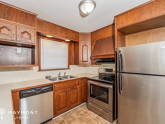 The inviting living room flows seamlessly into the dining area, featuring attractive hard-surface flooring throughout for both beauty and practicality. The well-designed kitchen showcases warm wood cabinets paired with modern stainless steel appliances, creating the perfect balance of traditional charm and contemporary convenience.