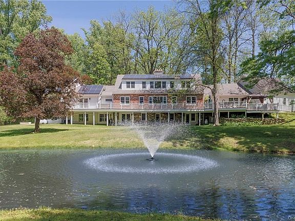 Unique Rhinebeck Residence: Village Living with Tranquil Surroundings. Spanning over 5,200 square feet and situated on 4.3 acres of serene countryside, this home offers an unparalleled blend of comfort and convenience. Set on a quiet cul-de-sac, just a stone's throw from the center of Rhinebeck Village, this property provides a peaceful retreat while still being conveniently located. 7 bedrooms, including a primary first-floor suite with a spa-like bath, multiple home offices and a completely finished walk out garden level with three bedrooms, bath and entertainment areas. Gourmet kitchen with breakfast nook, six-burner Viking range, two dishwashers, center island and adjacent formal dining room with lovely views. Upstairs are three spacious bedrooms and 2 full baths. Extensive back deck overlooking pond for outdoor entertaining and relaxation.Two 2-car attached garages (one with heated floor) providing ample storage space and an extensive new solar array for energy efficiency.