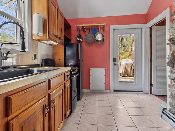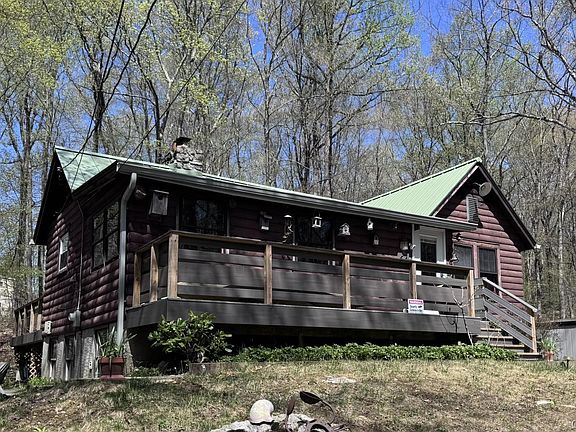 Country log cabin retreat, in a serene woodland setting, in the heart of the private Hill and Dale Country Club community. This charming home with a warm and inviting living room (soaring cathedral ceiling and a beautiful floor-to-ceiling stone fireplace) is perfect for cozy evenings. Deck off entrance foyer. Wonderful beamed ceilings and hardwood floors in living areas. A sunlit dining room and second deck just off the kitchen offer ideal spaces for entertaining or quiet reflection. Primary bedroom includes beautiful solid wood armoire. 2nd bright bedroom. Full bath with claw-foot tub, vintage tile, and Toto toilet (with remote, heated seat and bidet). Basement workshop with storage and utilities. Above-ground oil tank. NEW septic system installed June 2025. Exclusive access to Palmer Lake, where you can swim (lifeguard Memorial Day–Labor Day), or enjoy kayaking, canoeing, and paddleboarding in addition tennis courts, baseball and soccer fields, and a park/playground. HOA amenities also include trash pickup, snow plowing, and maintenance of roads, beach and other common areas. Visit www.hillanddale.net for more details. Additional inclusions: canoe, kayak, fire pit, 3 whisper quiet A/C units, bug zapper, lawn mower (electric, with 100 ft. cord), portable generator (gas). Taxes may be reduced with the Basic STAR Deduction, for eligible buyers.