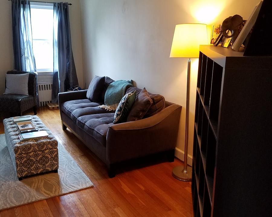 Bright townhouse condo with 3 floors. 1st floor with hardwoods has a living room, dining area and small kitchen. 2nd floor with carpeting has 2 bedrooms and the bathroom. One bedroom is 12x12 and can fit a queen bed. The other bedroom is 10x9 and can fit a twin or double bed or can be an office. Both bedrooms have lots of light with 2 windows.