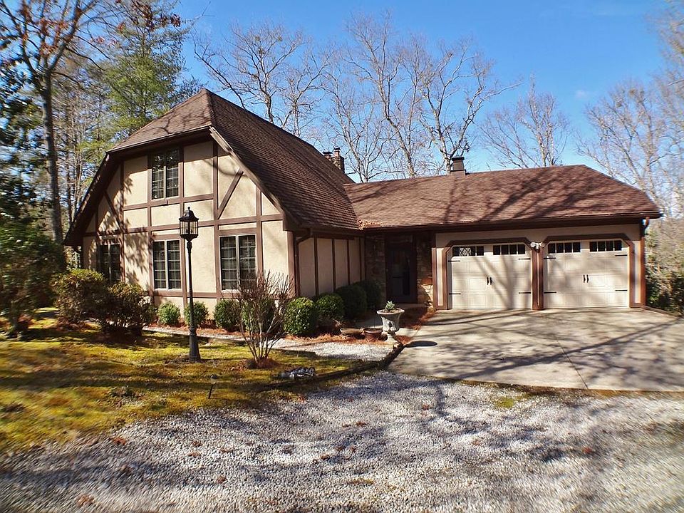 Welcome to Rosewood Cottage a beautiful English Tudor nestled in a natural setting with lots of native and flowering plants.This small neighborhood only has three homes which provides privacy for all. Step inside and experience the massive stone fireplace built with Nantahala river stones that reaches to the cathedral tung'n'groove ceiling with beams. The open living and dining room all with wood floors opens to the large freshly painted deck and is a perfect setting for entertaining. The kitchen is any chefs dream with granite counter tops, ceramic backsplash and custom cabinets, room for a breakfast table and a wall of built in cabinets. Just off the kitchen is a lovely sun room with lots of windows to enjoy the natural setting. The first floor master is very spacious w/ a new bathroom w/granite & glass tiled surround in the tub. This is a one floor living with laundry and a two car garage. Upstairs has two bedrooms and an updated bath & storage closet. This home has so many updates and so well maintained, what an experience it would be to live here. That's not all, if you need more space, the lower level is ready to finish with heat and air already in place and a wood stove.