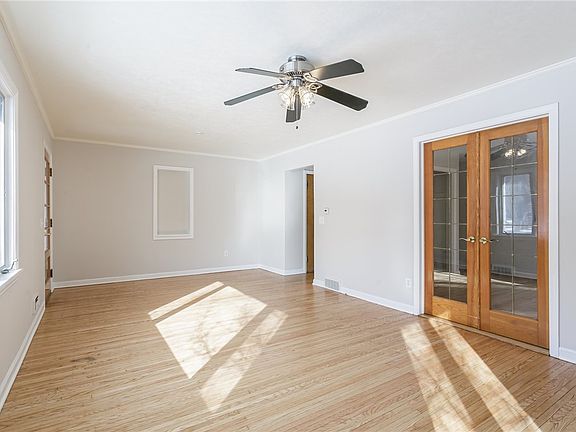Deceptively large, this 5-bedroom, 2.5-bathroom home offers plenty of natural light and spacious living. Newly refinished floors grace the first floor, starting with a first-floor living room that flows through French doors into a distinct dining room—ideal for entertaining or relaxed evenings. The generous kitchen offers a separate eat-in area for added convenience. The first-floor primary suite has a bathroom and linen closet. A second room can be used as bedroom or office, and a half-bath rounds out the first floor. Upstairs are three nice-sized bedrooms, a full bathroom, and multiple large storage spaces. The huge, unfinished basement boasts a wide-open layout and the attached garage features built-in storage shelving. Outside, the large fenced yard features patio and garden areas as well as a custom-built wooden playhouse. Newer mechanicals and a recent roof provide peace of mind - move in and make it your own!