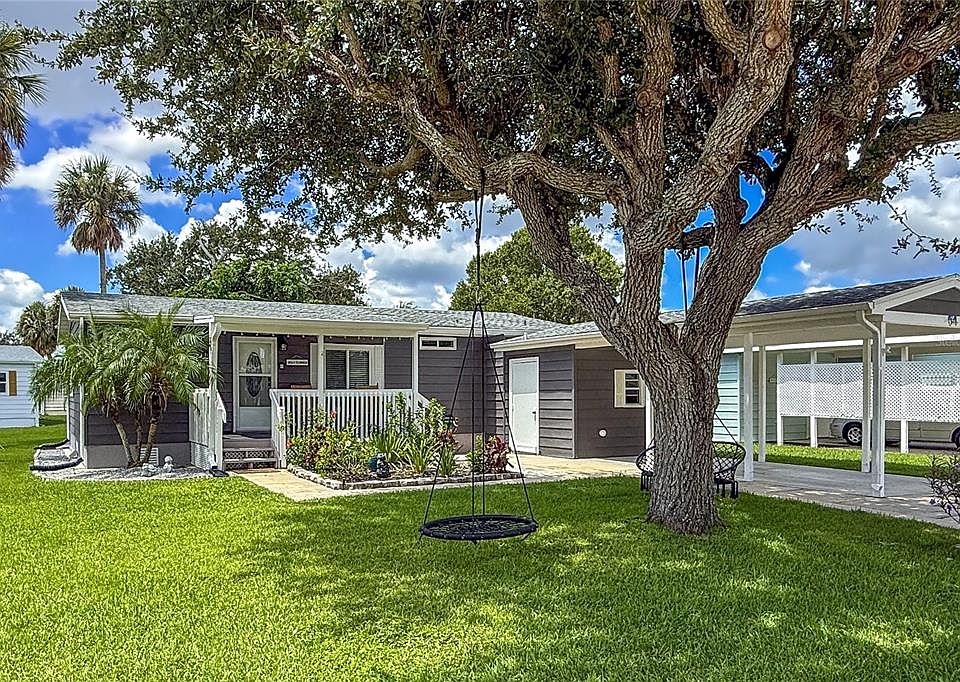 Ready to move in to this amazing costal cottage? This land owned home will not last long in the 55+ Community of Ridgewood Meadows. Home is beautifully landscaped. Great location on a quiet street just a few steps away from the club house and pool. Inside and out, this open-floor plan home features many recent upgrades: new laminate flooring (2025), double pane windows w/marble sills, AC unit, vapor barrier (2025), roof & washer and dryer. Water heater was installed in 2023 and is located outside the home in the storage unit. Kitchen features S/S appliances, beautiful counter tops and cabinets with a center island. Crown molding throughout the main living room and barn doors have been installed in the primary bedroom leading to the primary bath and walk-in closet. This home has a very large walk-in closet in the primary bedroom. You can choose to enjoy your morning coffee on your spacious front porch or on the beautiful lanai out back. Lanai features all new windows, tile floor and access to a separate deck for grilling, sunbathing or entertaining. Home has a transferable home warranty. The Ridgewood community provides 24 hour/day, 7 day/ week gated security. Easy access to shopping, the interstate and restaurants. New pickle-ball courts, exercise park, tennis courts, community pool, great fishing, club house and lots of activities to enjoy. All room sizes are approximate. All information is deemed reliable but should be verified by buyers and/or buyer's agent.