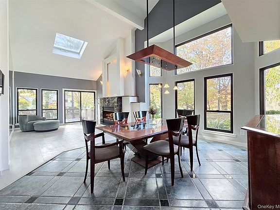The main level showcases a bright, open kitchen with custom windows that flood the space with natural light. The adjacent formal dining room features soaring cathedral ceilings and expansive windows, while the inviting living room centers around a gas fireplace with custom accent lighting and opens to a bi-level deck, perfect for outdoor entertaining. The primary suite offers a peaceful retreat with skylight, updated en-suite bathroom, and generous closet space. Additional bedrooms provide ample room for family or guests, with large closets throughout.