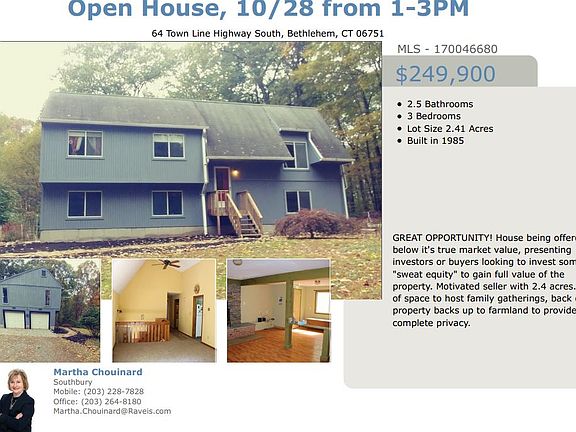 GREAT OPPORTUNITY! House being offered below it's true market value, presenting investors or buyers looking to invest some "sweat equity" to gain full value of the property. Contemporary raised ranch with open layout set back on 2.4 acres all for $3,816 annual taxes. Cathedral ceilings in living room with brand new carpet. Property backs up to farmland providing beautiful sunset views. Brand new well pump installed with freshly painted exterior & landscape improvements. Level lot with perennial flowers and potential to put your finishing touches throughout property, (some TLC is needed). Home next door SOLD for $300,000 in 2017;priced to attract buyers willing to put in some "elbow grease" to gain the benefit of the property value which is located on a state road with a scenic commute to Waterbury, Torrington or Southbury.