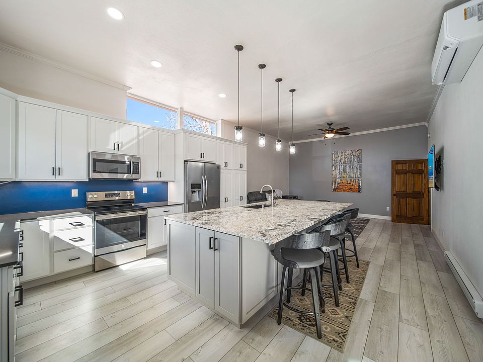 Completely Redone 2 Bed, 1 Bath Rental Unit in the Heart of Bayfield, CO with a fully fenced yard. Welcome to your dream rental in Bayfield, located on Mill Street! This freshly remodeled 2-bedroom, 1-bathroom unit offers modern comfort and convenience in the heart of town. Multiple restaurants are just seconds away from your front door, making dining out a breeze. Step into a beautifully updated interior featuring granite countertops that add a touch of luxury to your culinary space. The brand new floors and cabinets provide a fresh, contemporary look, while the mini-split unit ensures efficient air conditioning and heating that can be adjusted per room year-round. Additionally, the pellet stove offers cozy warmth during the cooler months. The bathroom has been completely redone, boasting a stunning tile shower and touch LED mirror with extra storage. Outside, you'll find a large, fully fenced yard perfect for pets or entertaining, complete with a deck where you can soak up the sun and enjoy the beautiful Colorado weather. Don't miss out on this fantastic opportunity to make this stylish and comfortable unit your new home. Contact us today to schedule a viewing! ADDITIONAL DEPOSIT MAY BE REQUIRED FOR PETS. Looking for a 6 month minimum commitment, year lease would be preferred. Owner Pays for water and trash up to $100 per month. Tenant pays for Electric and Wifi. Private Parking off street in the alley is included for up to 3 vehicles.