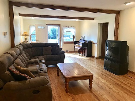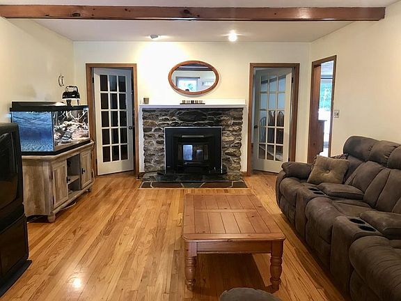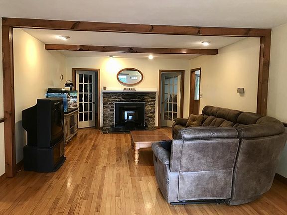 Charming and spacious one level living! This unique 4 bedroom, 2.5 bath ranch offers a large, open concept living room with hardwood floors, decorative beams and gorgeous fieldstone fireplace with pellet stove insert. Cabinet packed, fully applianced kitchen with tile counter and flooring, formal dining room with french doors, choice of two master bedroom options. First master bedroom featuring hardwood floor, bay window with seat and private 1/2 bath or choose the other master with private entrance and adorable updated mini-bath with custom tile shower. Two additional bedrooms offer hardwood floors and cedar closets. Exterior features include deck with vinyl railings, storage shed, recent exterior paint and public utilities!