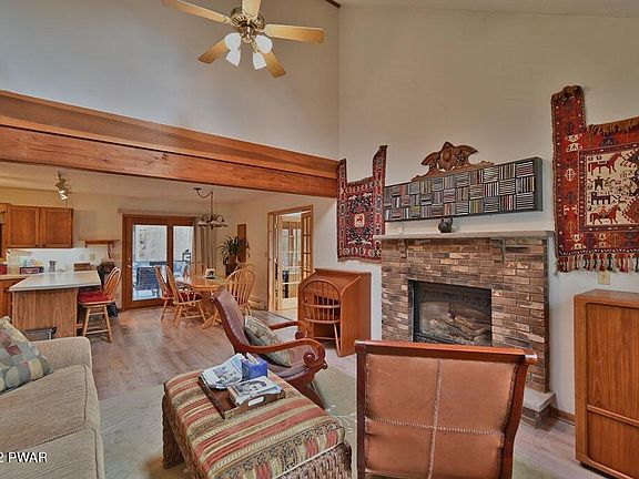 CALL FOR HIGHEST AND BEST BY MIDNIGHT TOMORROW, 5/31/22. This is an incredible opportunity to make that dream to move to the Pocono Lake region a plan. Wake up every AM to serene views from this fabulous and well cared for home. Enjoy your coffee from one of several outdoor areas with your choice of one of 3 decks or the extra roomy screened in covered porch. The home features a great layout with a primary bed, bath and laundry room on one side and an open living/kitchen/dining and great room with 2 fireplaces on the other. Above there's two additional bedrooms and a study/den with yet another fireplace. On the lower level is an extra room (potential 4th bedroom or home office or gym.... you decidd. Situated on a larger than an average lot. Exterior features of the property include an outdoor firepit; a shed currently utilized as an art studio, a garage and paved drive, and a heated, dry crawl space that will provide loads of extra storage space for all our outdoor and sporting equipment. Heated, dry, holds large quantities of sporting equipment, storage. The Hideout is a desirable gated community in the heart of the Poconos with resort style owner benefits including a golf course, 3 lakes, 2 outdoor heated pools, indoor and outdoor tennis courts, and clubhouse/sportsbar complex, just to name a few). Located 2 hours from the NY/Philly areas.