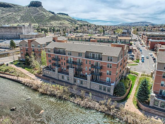 Incredible and very rare opportunity! This stunning 2 bedroom + Office, 2 bath unit sits in a majestic location overlooking Clear Creek in downtown Golden! As you enter, you're greeted by an expansive kitchen with large pantry, granite countertops, stainless steel appliance package, and Maple cabinets w/slide out storage. There is room at the kitchen island for eat in space, as well as the dining room. The living room is cozy and comes complete with a gas fireplace for those winter nights and plenty of wall space for a large flatscreen TV. Main bedroom overlooks creek and has a large 5-piece bath w/huge walk in closet. NE facing corner office can double as a 3rd bedroom if you choose and has French doors, a large closet w/shelving and overlooks Clear Creek & North Table Mountain. As you continue through the unit, you'll find a light & bright 2nd bath w/custom tile and window. Second bedroom has sliding glass door and a large closet with shelving.Unit has been well cared for and features a gas fireplace, wood floors, and a private balcony overlooking the creek for that romantic dinner or morning coffee! In unit laundry is not only convenient, but also included! Wonderful HOA, secure building, fire sprinklers, and heated garage w/ 1 parking space & storage locker. Everything is right out your front door including numerous shops/restaurants, The Buffalo Rose, Tributary Food Hall, The Golden Mill and more! Get away to the mountains in a matter of minutes! Your options for adventure are many as well! Tubing, fishing or kayaking on Clear Creek, or simply strolling the miles of biking/walking paths. Numerous parks nearby including Golden Gate Park, Lookout Mountain and Apex Parks. Be sure to see the Matterport tour link to see the layout of the unit, as well as the additional aerial photos of the surrounding area.