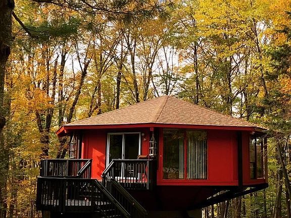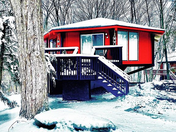 MID CENTURY MODERN MARVEL WITH SPECTACULAR VIEWS. Welcome to your dream retreat. This custom Topsider Pedestal home has been stunningly decorated to reflect the mid-century modern aesthetic and beckons those looking for a unique and inviting living space. Nestled on a wooded lot in the Hideout, the Pocono's premiere gated and amenity rich community, this home features an efficient layout with 3 comfortable bedrooms and 2 baths, and 360 degrees of panoramic windows to catch the brilliant sunsets and seasonal views of Roamingwood Lake. The floor plan effortlessly connects the living, dining and kitchen areas. Step outside onto the wrap around deck to immerse yourself in all the glory of the natural setting. With a profitable rental history, over time this home could practically pay, Beds Description: 2+BED 2nd, Beds Description: 1BedLL, Baths: 2 Bath Lev 2