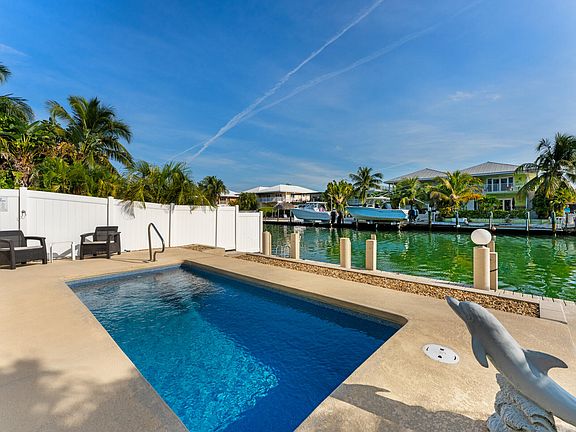 Welcome to this inviting east facing, waterfront, stilted half duplex in Key Colony Beach, offering three bedrooms, four bathrooms, and nearly 1,600 square feet of interior living space. With 37.5 feet of concrete seawall, step down wooden dock with concrete pilings, heated and chilled pool, and a spacious concrete patio for lounging and entertaining, this property is perfectly designed for the Keys lifestyle. Peace of mind features include metal roof, Hardie board siding, recently upgraded impact windows and doors, and a 2020 AC. A generous carport and driveway provide ample parking, along with a downstairs enclosure that features a full convenience bathroom, air conditioned cabana room, and a one car garage for storage of toys and gear. Saltillo tile flows throughout the first level, where you will find an open concept great room with soaring ceilings that connect the kitchen, dining, and living areas. Enjoy indoor to outdoor living from the large covered second floor patio ideal for al fresco meals, morning coffee, or watching stunning sunrises over the canal. The newly renovated primary bathroom showcases a spacious step-in tiled shower, quartz topped vanity, and elegant gold finishes. A comfortable guest bedroom and bathroom are conveniently located on the same level, with laundry in the hallway closet. Upstairs, the loft offers a third bedroom and full bathroom with plank flooring, creating a private retreat for guests or family. Your Key Colony Beach haven awaits. The City of Key Colony Beach offers its own police department, City Hall, tennis and pickleball courts, dog park, nine hole par three golf course, two playgrounds, and two new restaurants opening soon. Enjoy the walkable island lifestyle and the best of coastal living here!