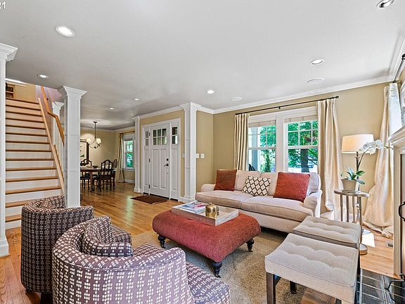 Spacious and delightful First Addition charmer with idyllic patio/yard spaces & main level living full bdrm w/French doors & full bath. Revel in the open gourmet kitchen w/sunken family room opening to entertaining patio & picturesque landscaping. Private upper level owner's suite w/dual walk-in closets, laundry & spa bath. Media or fitness rm w/vast storage rms + unfinished bonus space over detached garage. So many options! Walk to school and downtown Lake Oswego's vibrant amenities!