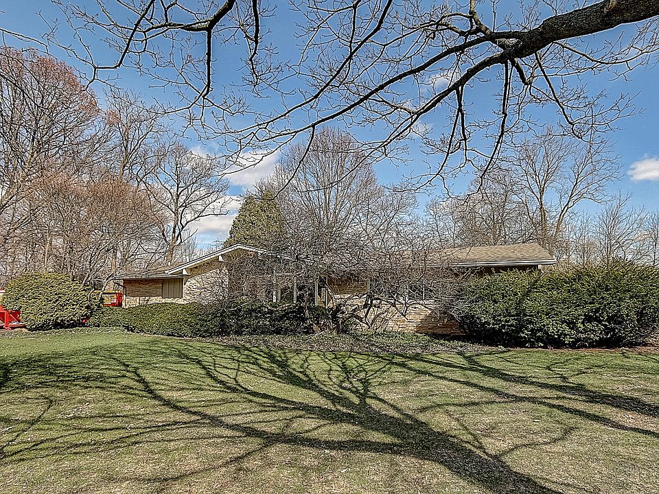 Beautiful Mid-century modern(MCM) one-story home set on a great .46 acre mature lot featuring masterfully planted and maintained gardens. Fantastic open Great Room & Dining Room features an impressive stone fireplace, an abundance of built-ins and a wall of windows overlooking the Deck, Yard and Gardens. Recently refinished Red Oak Wood floors are nearly everywhere including the Master Bedroom Suite with Tile Floor & Vanity, plus a super cool Walk-in Shower. Eat-in Kitchen offers loads of cabinet space, single pantry closet & garage access. Spacious extra Bedrooms are served by a Retro Hallway Bath featuring a Dual Vanity and Shower-over-tub. Huge unfinished basement for storage and/or your future finishing plans. Some Photos show Wood Floors in mid Re-finishing. Immediate Occupancy
