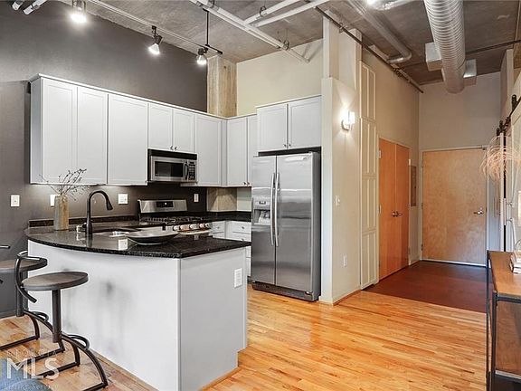 Authentic city loft in vibrant Old Fourth Ward. This boutique building features all the hallmarks of a classic loft including exposed brick/ductwork, 10+ ceilings, concrete & hardwood floors. Open concept living/dining/kitchen area perfect for entertaining. Gorgeous wall of windows flood the space with natural light. Kitchen includes grey cabinetry, breakfast bar, stainless appliances, gas cooktop. Oversized master bedroom with barn door, walk-in custom closet. Master bath with double vanity, separate tub, frameless shower. True second bedroom with ensuite bath, frameless shower, walk-in closet. Private balcony perfect for morning coffee, evening cocktails. Extra storage space above bedrooms. Solid concrete and steel construction, 2 deeded parking spaces, saltwater pool, gated entry. Step outside to the hottest thing in Atlanta - the BELTLINE! Walk to Ponce City Market, Piedmont Park, Old Fourth Ward Park, Inman Park, Krog Market, festivals, restaurants, shops, cafes. Intown Atlanta's best walkable location. Strong community and HOA. Google Fiber Internet, Gas, Water/Sewer, Trash, Pool, Dog Run included.