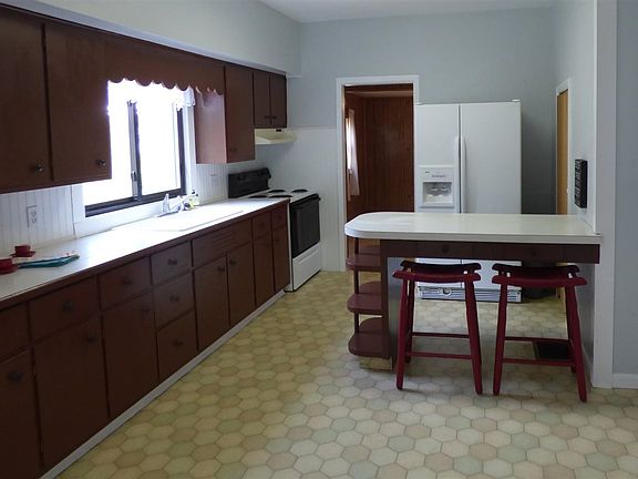 AFFORDABLE 3 BR HOME w/bonus room on .56 acres on edge of Elnora. Well maintained with many new improvements over the past 10 years including siding, windows and doors. Solid home has new HVAC system, flooring and new insulated doors w/openers on 2-car garage. Comes with stove w/hood, refrigerator, microwave, water softener, washer and dryer. Large lot from street to street.