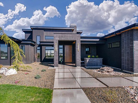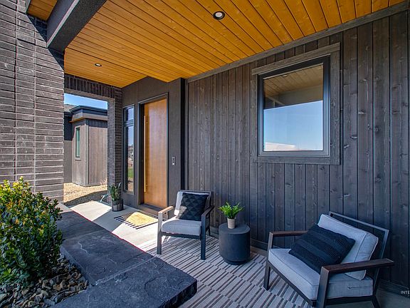 Luxury living in Eagle with this stunning 3,000 SF single-level home, nestled on nearly an acre. 3-bedroom, 4.5-bathroom, a versatile flex room offers elegance & functionality. Awe-inspiring great room, soaring ceilings, dramatic cedar accents, & wood-framed windows flood the space with natural light. High-end fixtures, a custom fireplace create a warm, sophisticated ambiance. Gourmet kitchen featuring Thermador appliances. Adjacent dining room, framed by walls of windows, seamlessly connects to patios on either side. Luxurious master suite opens to direct patio, & a spa-inspired bathroom complete with custom closets. Multiple patios, including a fully equipped outdoor kitchen, fire pit, water feature, all set against a backdrop of landscaped grounds. Enthusiasts love the 40' RV garage, complete with built-in cabinets, enclosed mechanical room, sink, epoxy flooring, a heater for comfort. Unique elegant modern architecture defines this home, blending sleek design with timeless luxury.