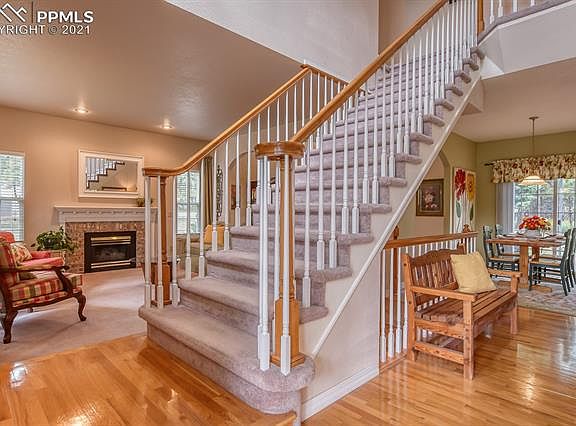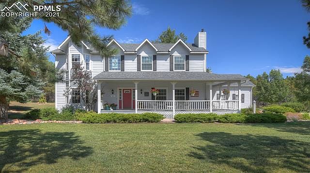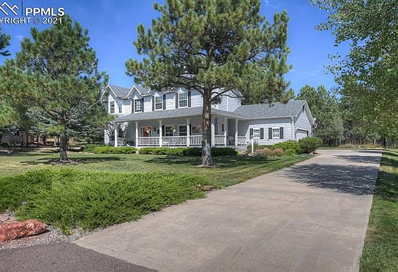This beautiful country home in the area of Woodmoor is situated on a acre lot with a huge welcoming front porch perfect for relaxing on a Colorado evening. Two story entryway with hardwood flooring that opens into the gourmet kitchen that features a center island, granite countertops, stainless steel appliances, a planning desk, a kitchen pantry, and a breakfast nook that walks out to a spacious deck and patio perfect for entertaining. The formal living room features a gas fireplace, a bay window with an archway separating the formal dining room that features a secondary entrance to the rear deck. The great room boasts a gas fireplace with a surround built-in entertainment center and features a large custom mantel. The private master retreat is on one side of the upper level and features a cozy bay sitting area and French doors that lead into the 5 piece master bath and the walk-in closet. The other wing of the upper level features three additional bedrooms all with double closets and a full-size bath. The lower level features a family room with a wet bar, a separate game area plus an additional bedroom and a bath. Very private location backing to wooded parcels of land. Woodmoor is just minutes to I-25 and the USAFA and has its own 24/7 security, ponds, and open space for hiking. The town of Monument features fun activities like the Santa Fe Trail, Monument Lake for kayaking and paddleboarding, Farmers Market, Art Hop, fine dining, breweries, and a fabulous 4th of July Parade. A must see!