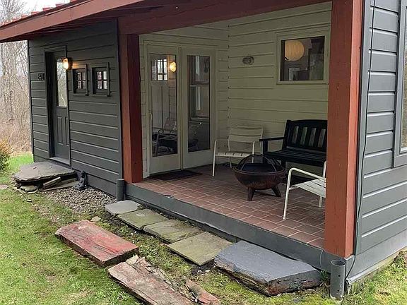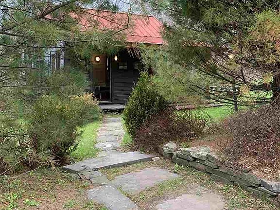 The quintessential country pied-a-terre! This completely refurbished cottage offers the most elegant living in under 500 sq. ft. you can imagine. Light pours into the open floor plan kitchen, dining, & living area. A cozy sleeping loft (reached by a rolling ladder on a track), in addition to the one bedroom increases it's versatility. Modest though the house may be, it boasts a full walk-out basement with substantial workshop space in which you will find a newer boiler, on demand hot water system, newer electrical panel & double pane windows. A Nest thermostat allows you to arrive on a winter weekend to toasty warmth. Set on 3+ acres abutting over 100k of state land, the property makes a wonderful playground in all seasons. There is a separate garage, originally 2-car, with one side turned into studio space with tiled floor, water piped to it, and looking out at the mountain view. Seller has insulated & partially finished stand-up attic space for possible future use of your choice.