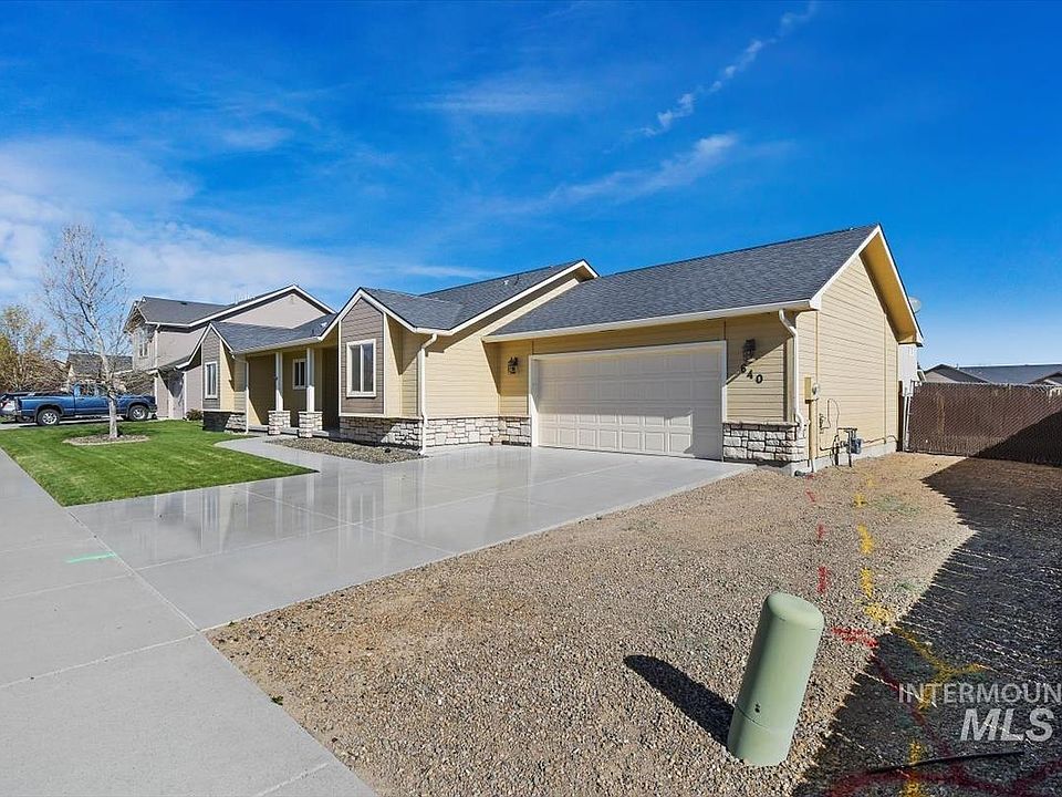 Nestled in the desirable Silverstone Subdivision, this modern home boasts three spacious bedrooms, two bathrooms, and an array of high-end features. The interior features vaulted ceilings that enhance the open and airy feel, while the split bedroom concept ensures privacy for the master suite, which includes large walk-in closets. The kitchen is a chef's dream with stainless steel appliances, a convenient pantry, and sleek modern fittings. Outdoors, the beautifully landscaped curbing leads to a serene backyard equipped with a firepit, perfect for gatherings or quiet evenings. The covered patio provides additional space for relaxation or entertaining. This home seamlessly combines style, functionality, and comfort, making it an outstanding choice for anyone looking for a ready-to-move-in property in a fantastic neighborhood. Check out the RV and toy area separate from back yard. This place truly has it all! No HOA